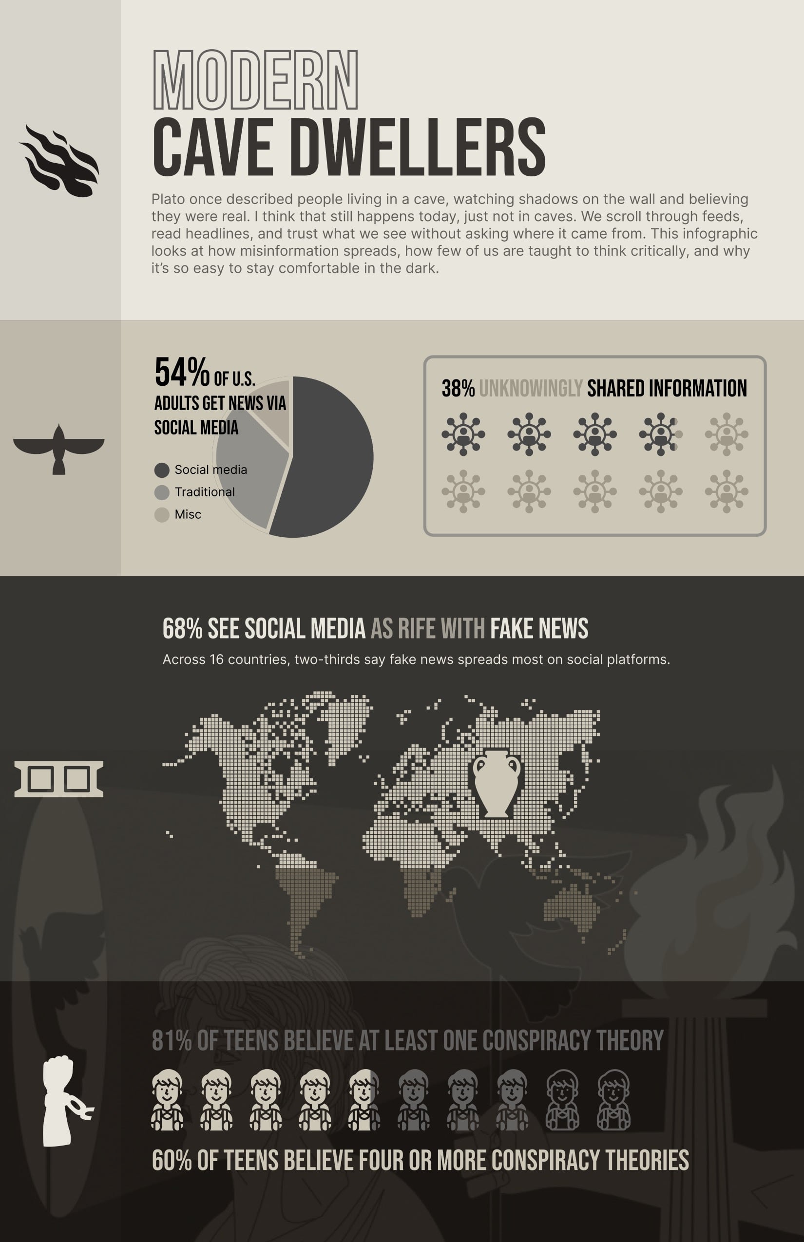 This infographic was created to extend the idea of Plato's Allegory of the Cave to the modern era. Even today, we experience similar ideas -- we scroll through social media feeds without reading them carefully, and only look at news headlines. We trust what we see without asking if the information we read was credible --just like living in the cave.